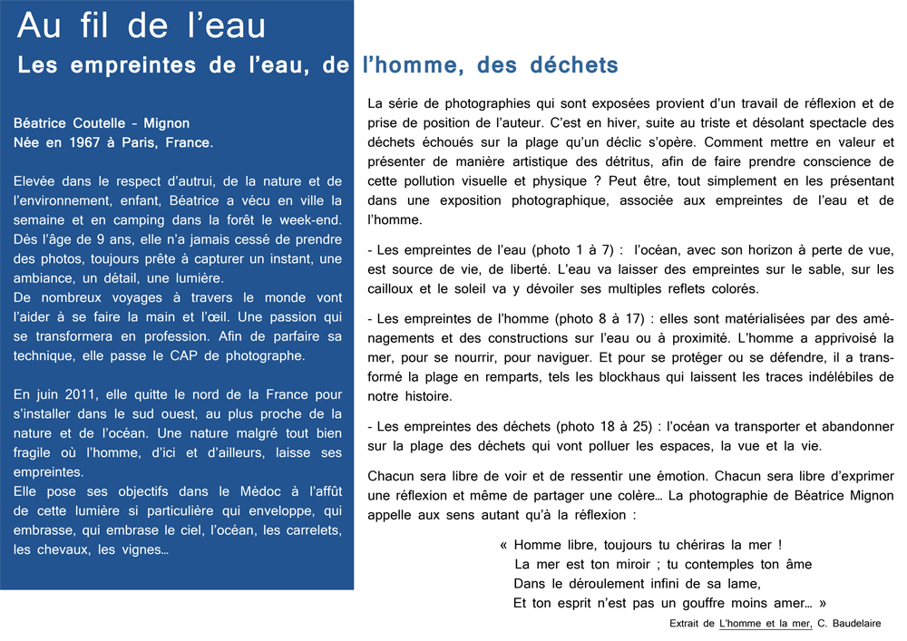 "Au fil de l'eau", les empreintes de l'eau, de l'homme, des déchets, voici le thème de l'exposition photographique de Béatrice Mignon.