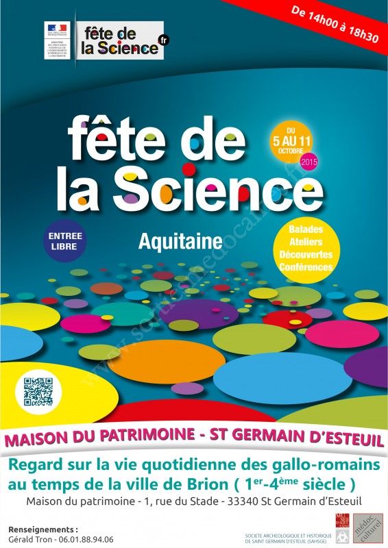Sous la houlette de l'association Médoc culturel et avec l'aide du Musée d'Aquitaine, de la Société Archéologique et Historique de St Germain d’Esteuil), la maison du patrimoine de Saint-Germain-d'Esteuil ouvre ses portes durant la semaine de la fête de la Science 2015 et expose dans 6 vitrines de nombreux objets rendus par le Musée d'Aquitaine après expertise et datation par ses archéologues. Ils nous permettent d'avoir un regard sur la vie quotidienne des habitants de la cité de Brion (Saint-Germain-d'Esteuil) entre le 1er et le 4e siècle après Jésus-Christ, et de nous faire une idée sur leur façon de vivre.