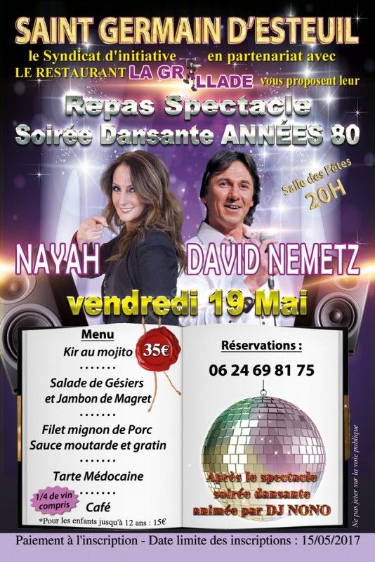 Repas Spectacle & Soirée Dansante Années 80 organisés par le Syndicat d'Initiative en partenariat avec le Restaurant La Grillade.