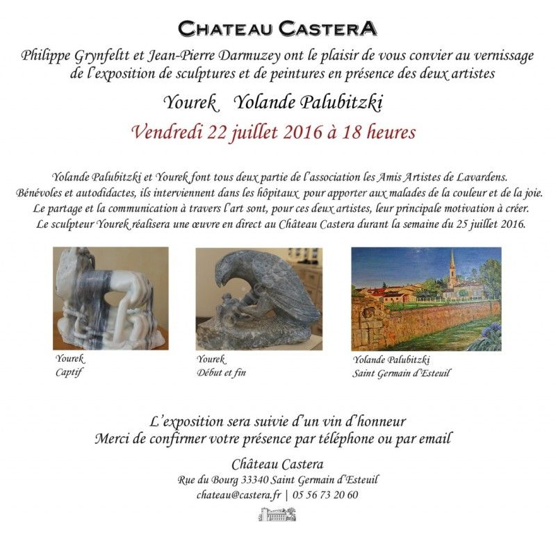 Château Castera a le plaisir d'accueillir à la propriété l'exposition temporaire des oeuvres de Yourek et de Yolande Palubitzki. Un vernissage est organisé le 22 juillet 2016 en présence des deux artistes.