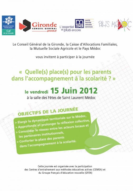 Le Conseil Général de la Gironde, la Caisse d’Allocations Familiales, la Mutuelle Sociale Agricole et le Pays Médoc vous invitent à participer à la journée.
