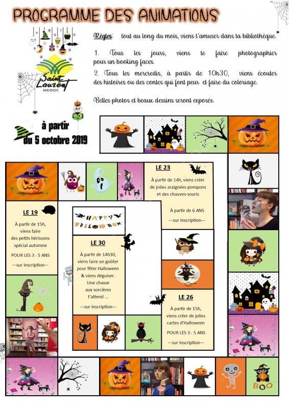 la Bibliothèque Municipale de Saint-Laurent-Médoc propose des activités pendant les vacances de la toussaint ; certaines sur inscription.... aussi Halloween.