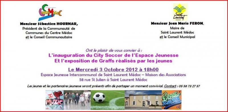 L'espace jeunesse intercommunal de Saint-Laurent Médoc organise une inauguration de son terrain de city soccer (en partie construit par les jeunes) et de l'exposition de Graffs réalisés par les jeunes de cet été !