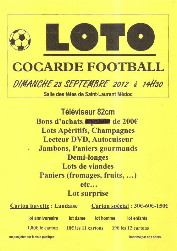 LOTO de la COCARDE FOOTBALL DE SAINT LAURENT MEDOC à 14h30 à la salle des fêtes le dimanche 23 septembre 2012