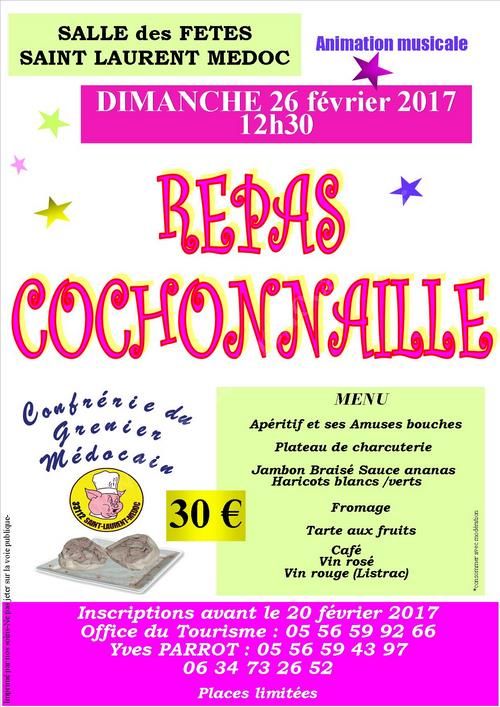 Repas Cochonnaille organisé par la Confrérie du Grenier Médocain avec animation musicale.