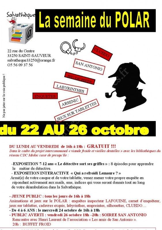 Ateliers ludiques autour du Polar et des enquêtes à mener seront proposés aux enfants tous les après-midi de cette 1° semaine de vacances de 16h à 18h (sauf le vendredi où il y aura à 18h une soirée SAN ANTONIO)