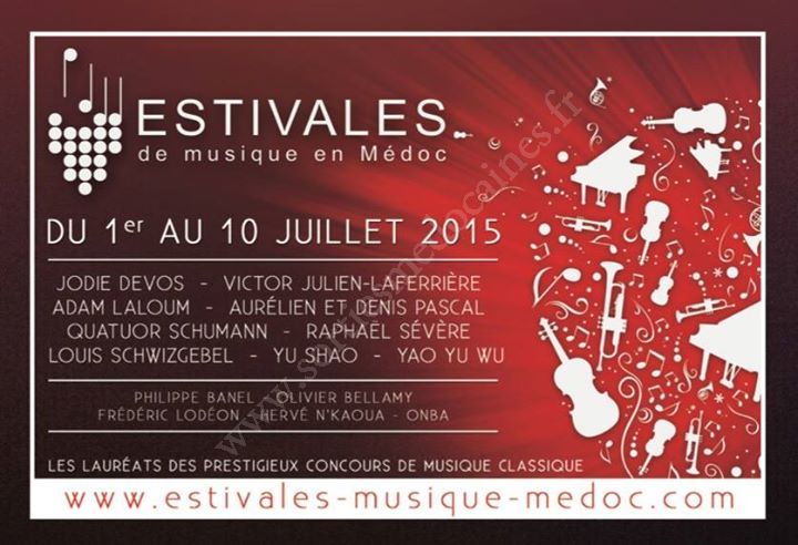 Egalement sélectionnés par le comité artistique de l’association festival 2015, la soprano Jodie Devos, le ténor Yu shao, le pianiste Louis Schwizgebel-Wang, le clarinettiste Raphaël Sévère, le pianiste Adam Laloum, le violoncelliste Victor Julien-Laferrière, le Quatuor Schumman le chef d’orchestre Yao Yu Wu à la direction de l'Orchestre National Bordeaux Aquitaine, se produiront aux Châteaux Branaire-Ducru, Lagrange, Lascombes, Loudenne, Lynch-Moussas.