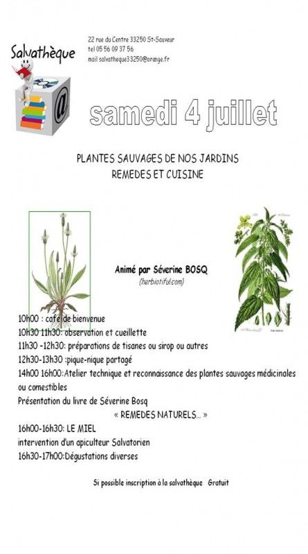 - 14h00 à 16h00 : Atelier technique et reconnaissance des plantes sauvages médicinales ou comestibles