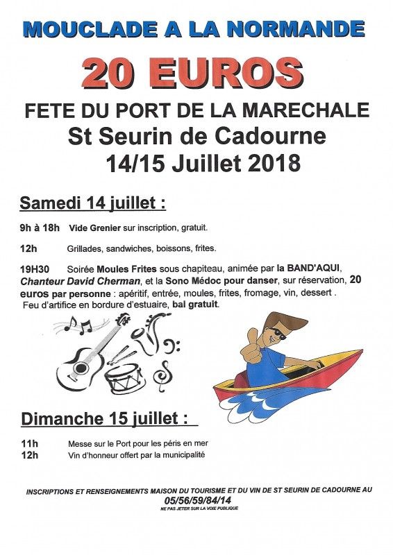 - 19h30 : Soirée moules-frites sous chapiteau, animée par la Band'Aqui, chanteur David Cherman et la Sono Médoc pour danser
