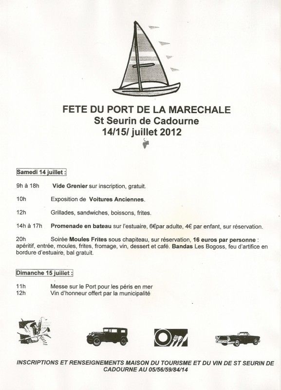 - 20h : Soirée moules-frites sous chapiteau (réservation obligatoire 16€/pers) : apéritif, entrée, moules-frites, fromage, vin, dessert et café. Bandas "Les Bogoss" suivi d'un feu d'artifice en bord d'estuaire, bal gratuit