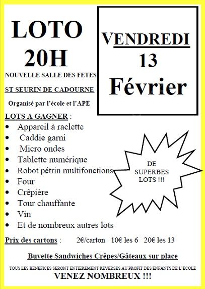LOTO organisé par l'école de St Seurin de Cadourne (APE+OCCE).