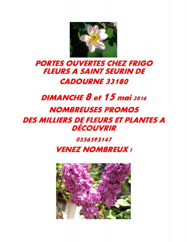PORTES OUVERTES CHEZ FRIGO FLEURS A SAINT SEURIN DE CADOURNE LES DIMANCHES 8 et 15 MAI 2016.