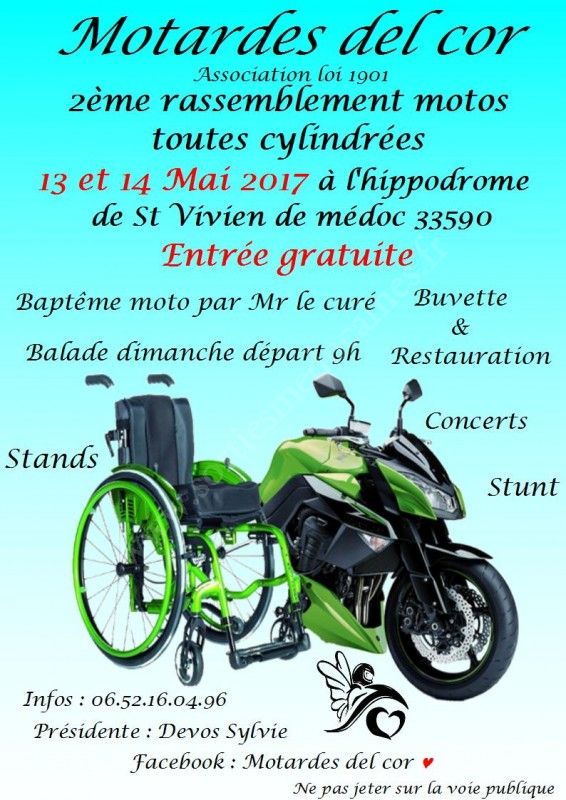 L'association Motardes del cor vous annonce notre 2ème rassemblement motos qui aura lieu le week-end du 13 et 14 MAI 2017 à l'ancien Hippodrome de St Vivien de médoc.