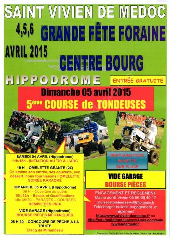 A l'occasion de la fête patronale et fête foraine de Saint Vivien de Médoc des 4,5,6 avril 2015, la municipalité organise le dimanche 5 avril 2015 la cinquième course de tracteurs-tondeuses.