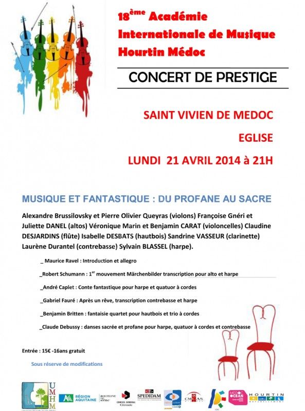 Avec : Alexandre Brussilovsky et Pierre Olivier Queyras (violons) Françoise Gnéri et Juliette DANEL (altos) Véronique Marin et Benjamin CARAT (violoncelles) Claudine DESJARDINS (flûte) Isabelle DESBATS (hautbois) Sandrine VASSEUR (clarinette) Laurène Durantel (contrebasse) Sylvain BLASSEL (harpe).