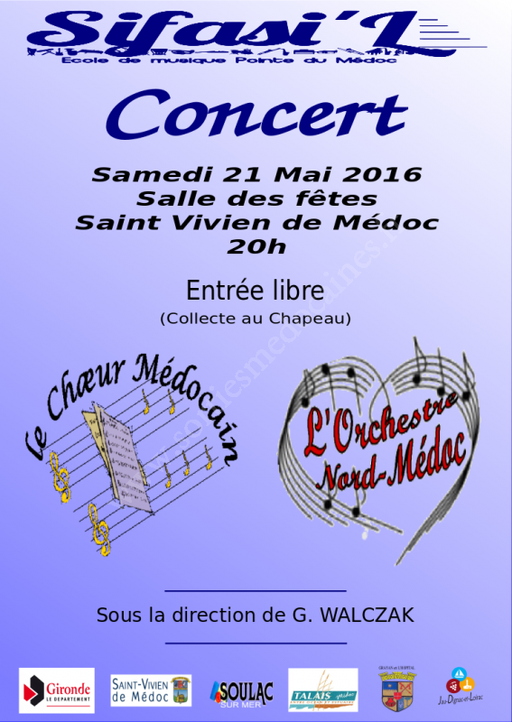 Le samedi 21 Mai 2016, l'école de musique SIFASI'L a le plaisir d'accueillir L'orchestre Nord Médoc et le choeur Médocain à Saint Vivien de Médoc.