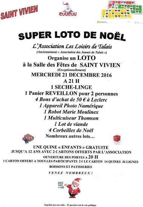 Loto de Noël organisé par l'association "Les Loisirs de Talais" (anciennement "Association des Jeunes de Talais").