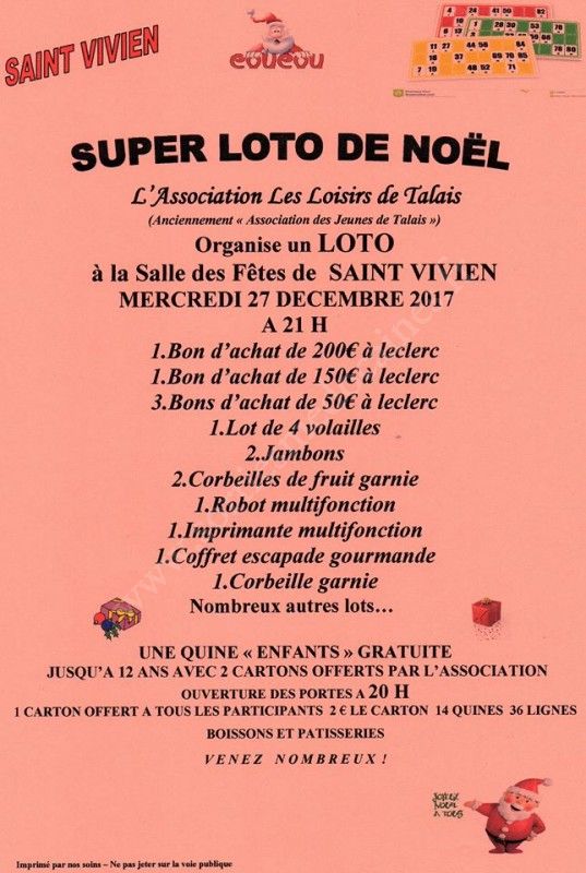 Loto de Noël organisé par l'Association Les Loisirs de Talais (anciennement "association des Jeunes de Talais").