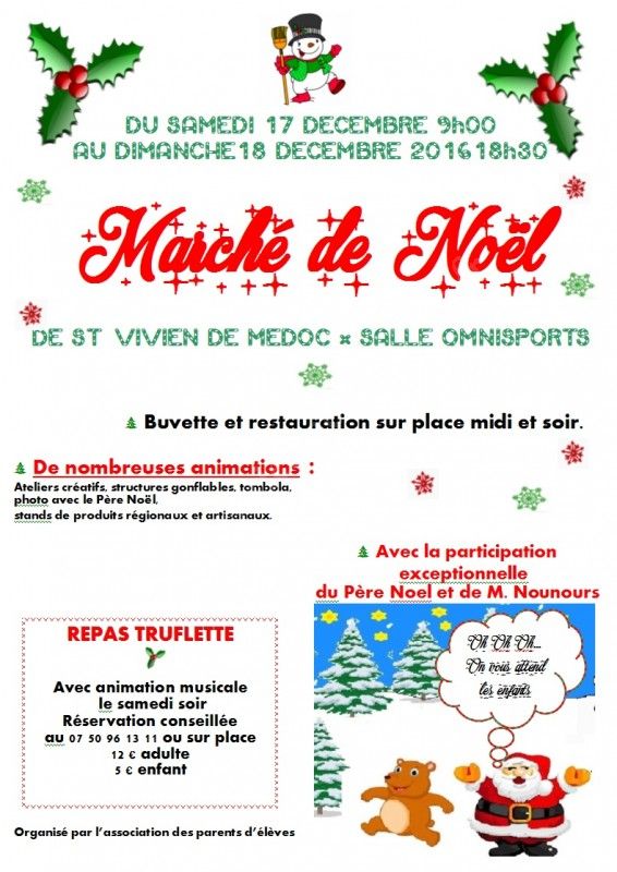 L'association des parents d'élèves de Saint Vivien de Medoc organise son marché de noêl le 17 et 18 décembre 2016.