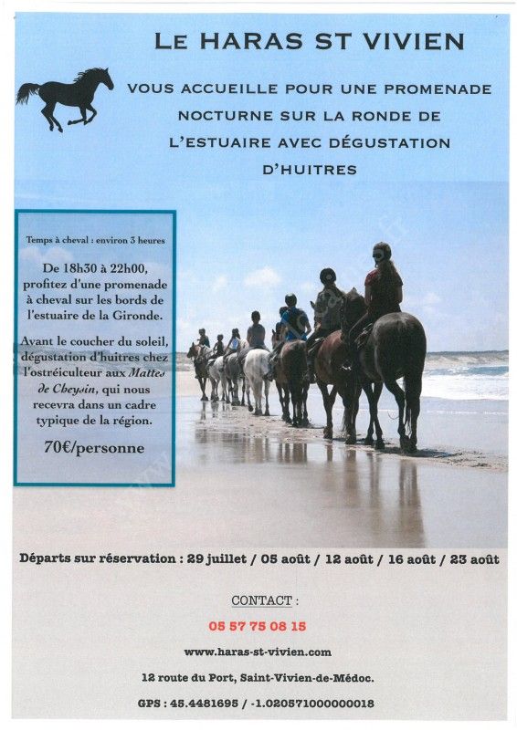 Le Haras St Vivien vous accueille pour une promenade nocturne sur la ronde de l'Estuaire avec une dégustation d'huîtres.