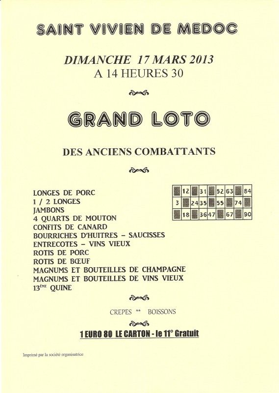 SUPER LOTO, organisé par les Anciens combattants du Canton de Saint Vivien de Médoc, au profit des oeuvres sociales, DIMANCHE 17 MARS 2013 à 14 H 30 - Salle des Fêtes -