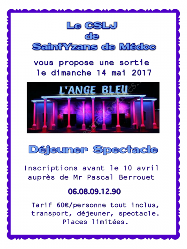Le CSLJ de Saint-Yzans de Médoc vous propose une sortie déjeuner spectacle à l'Ange Bleu.
