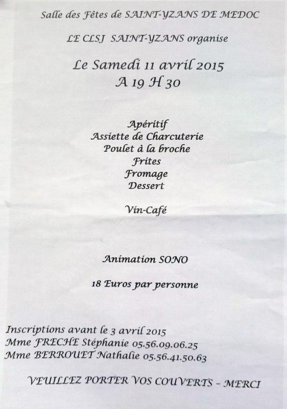 Dîner dansant organisé par Le CLSJ Saint-Yzans avec animation sono.