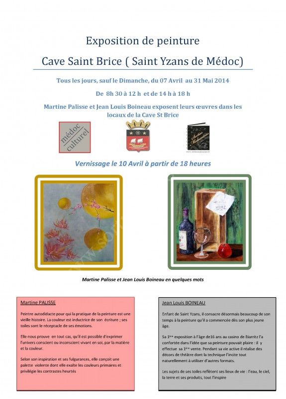 Vous êtes cordialement invités au vernissage de l'exposition des oeuvres de Martine Palisse et Jean-Louis Boineau jeudi 10 avril 2014 à partir de 18h dans la salle d'accueil de la cave coopérative Saint-Brice à Saint-Yzans de Médoc en présence du maire Segundo Cimbron, de Monsieur Faugerolle, Président de la cave, de son Conseil d'administration et des viticulteurs coopérants.