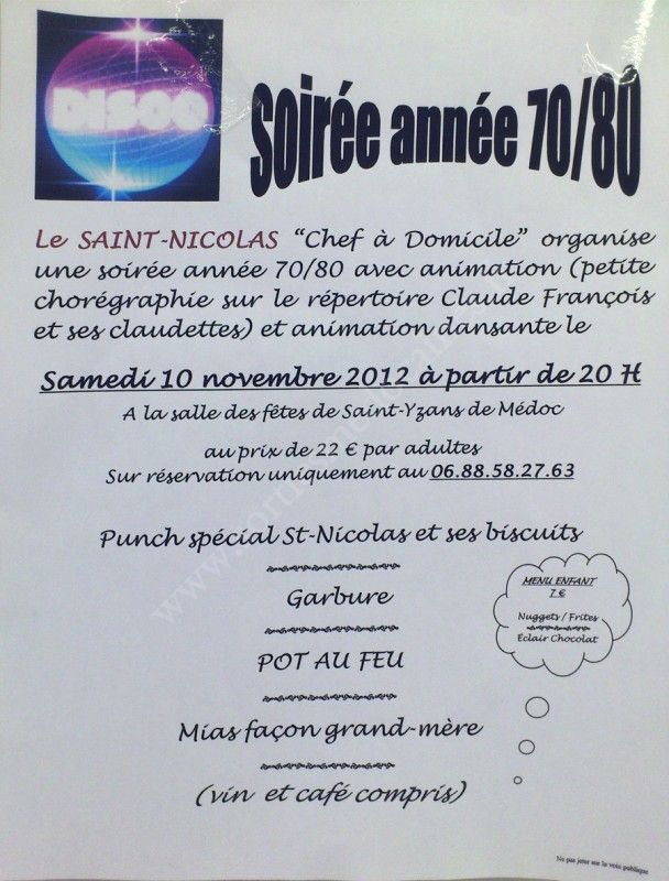 Le Saint Nicolas, chef à domicile, organise une soirée année 70/80 avec animation (petite chorégraphie sur le répertoire de Claude François et ses Claudettes) et animation dansante.