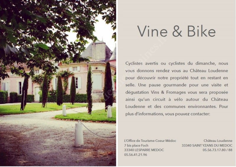 Vine & Bike "Destination Château Loudenne" : Cyclistes avertis ou cyclistes du dimanche, rendez-vous au Château Loudenne pour découvrir la propriété tout en restant en selle. Une pause gourmande pour une visite et dégustation Vins & Fromages (1h-1h30) vous sera proposée ainsi qu’un circuit à vélo (2h) autour du Château Loudenne et des communes environnantes.