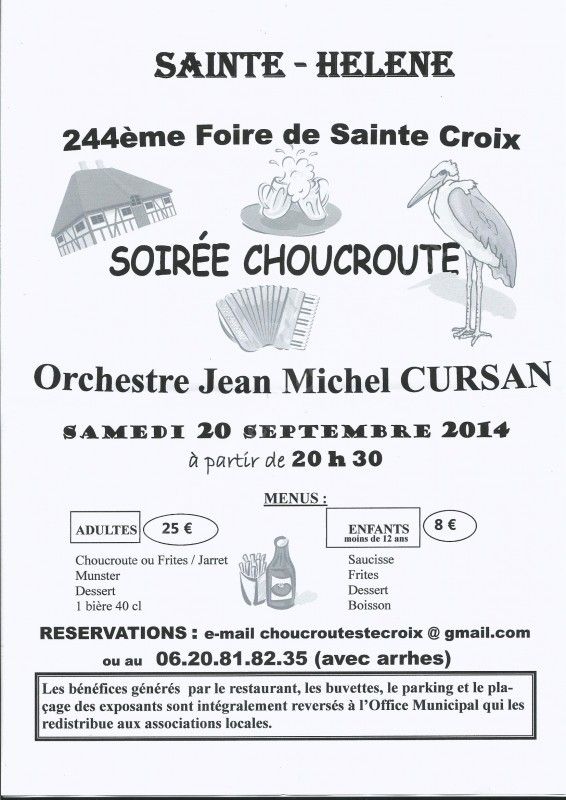 - 20h30 : Soirée choucroute Animée par l’Orchestre Jean Michel CURSAN. Sur réservation au 06.20.81.82.35 ou par mail : choucroutestecroix@gmail.com (25€/pers. - 8€ pour les moins de 12 ans)