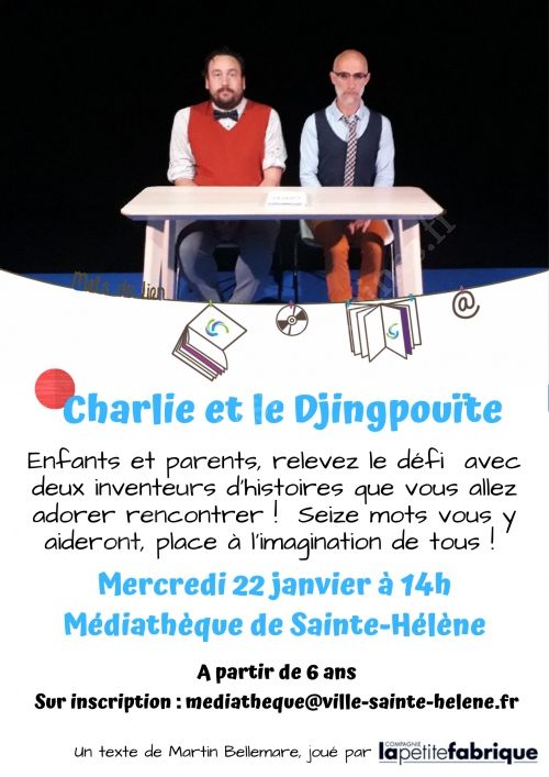 Le spectacle que vous allez découvrir est un défi lancé à deux inventeurs d’histoires. Ils vont recevoir devant vous 16 mots ; les lire à voix haute et vous les faire entendre, soyez attentifs. Ils devront ensuite inventer sous vos yeux une histoire mais pas n’importe laquelle, l’histoire de Charlie et le Djingpouite. Aucune limite à l’invention, tout est permis ! La seule règle, utiliser ces 16 mots : AMOUREUSEMENT, AVANCER, AVENTURE, BIBLIOTHÉCAIRE, CHEVEUX, DEUX, DICTIONNAIRE, DISPARAÎTRE, DUNE, ENDORMIR, HUITRE, PISTE, PROUT, SAVANTE, TROUPEAUX, VENT.