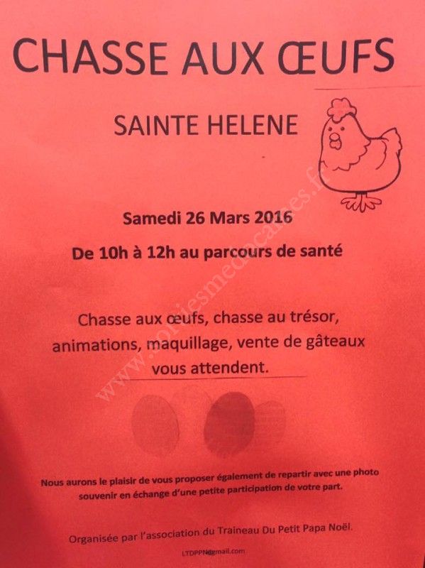 Chasse aux oeufs, chasse au trésor, animations, maquillage, vente de gâteaux vous attendent ce samedi 26 mars 2016 à Sainte-Hélène.