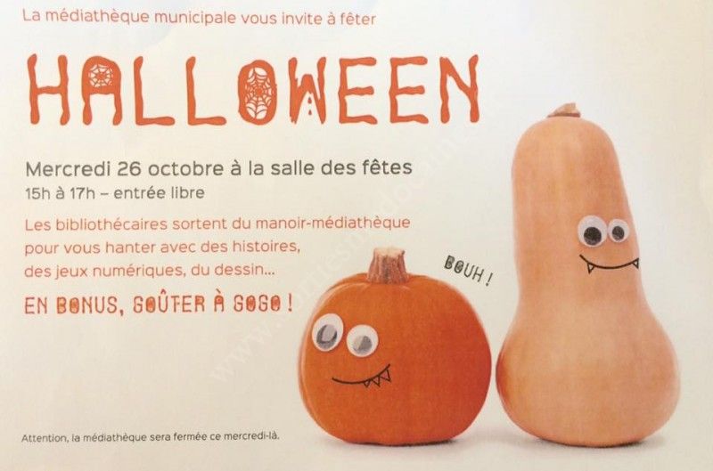 Mercredi 26 octobre 2016, la bibliothécaire sort du manoir-médiathèque pour hanter la salle des fêtes de Sainte-Hélène... Pour les jeunes, des lectures d'histoires, des jeux sur tablette, du dessin... le tout spécial Halloween, évidemment. BOUH !