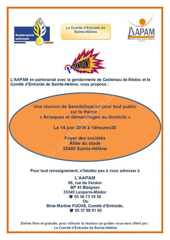 L’AAPAM en partenariat avec la gendarmerie de Castelnau de Médoc et le Comité d’Entraide de Sainte-Hélène, vous propose : Une réunion de Sensibilisation sur le thème : "Arnaques et démarchages au domicile".
