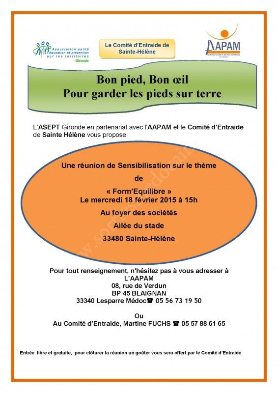 L’ASEPT Gironde en partenariat avec l'AAPAM et le Comité d’Entraide de Sainte Hélène vous propose une réunion de Sensibilisation sur le thème de "Form’Equilibre"