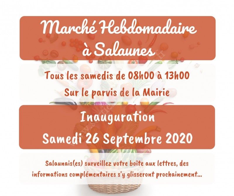 L'équipe municipale de Salaunes vous annonce la création d'un marché hebdomadaire qui se tiendra tous les samedis de 08h à 13h sur le parvis de la Mairie.