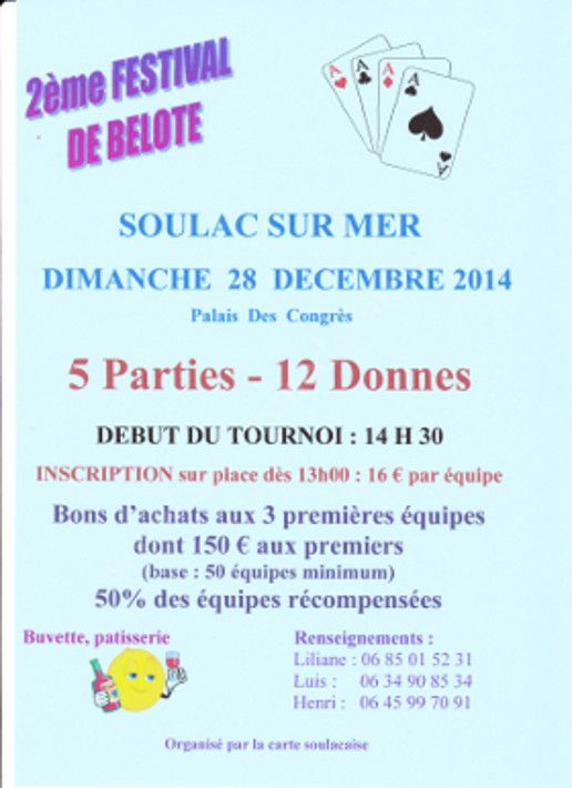 Comme chaque année nous organisons un concours de belote par équipes de 2 engagement joueurs 16€ l'équipe