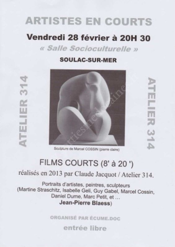 Films Courts (8' à 20') réalisés en 2013 par Claude Jacquot : portraits d’artistes, peintres et sculpteurs (Martine Straschitz, Isabelle Geli, Guy Gabel, Marcel Cossin, Daniel Dume, Marc Petit et ... Jean-Pierre Blaess).