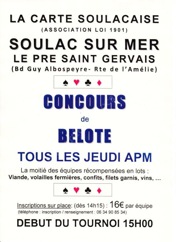 Tous les jeudi après-midi : concours de belote en doublettes organisé par l'association "La Carte Soulacaise".