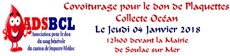 Départ du circuit Océan pour le don de plaquettes en covoiturage : Devant la Mairie de Soulac sur Mer