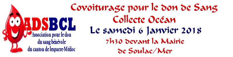 Ces covoiturages pour le don de sang sont effectués le SAMEDI matin, départ de Soulac sur Mer à 7h30. il est possible de prendre votre voiture également, lL'association ADSBCL vous réglera les frais de carburants si vous prenez des personnes avec vous.