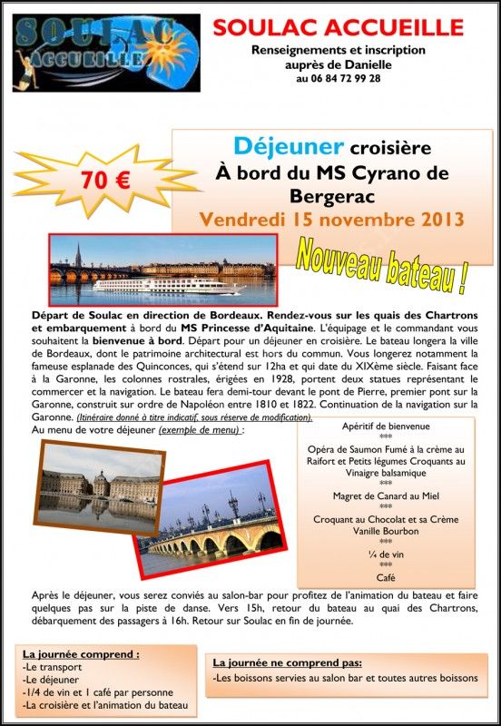 Après le déjeuner, vous serez conviés au salon-bar pour profitez de l’animation du bateau et faire quelques pas sur la piste de danse. Vers 15h, retour du bateau au quai des Chartrons, débarquement des passagers à 16h. Retour sur Soulac en fin de journée.