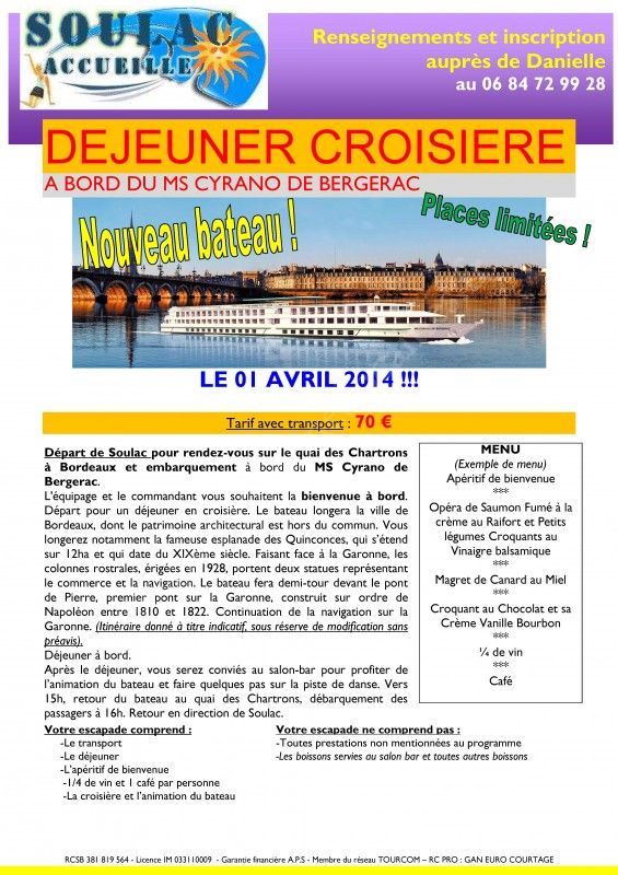 Départ de Soulac en direction de Bordeaux. Rendez-vous sur les quais des Chartrons et embarquement à bord du MS Cyrano de Bergerac. L'équipage et le commandant vous souhaitent la bienvenue à bord. Départ pour un déjeuner en croisière. Le bateau longera la ville de Bordeaux, dont le patrimoine architectural est hors du commun. Vous longerez notamment la fameuse esplanade des Quinconces, qui s’étend sur 12ha et qui date du XIXème siècle. Faisant face à la Garonne, les colonnes rostrales, érigées en 1928, portent deux statues représentant le commercer et la navigation. Le bateau fera demi-tour devant le pont de Pierre, premier pont sur la Garonne, construit sur ordre de Napoléon entre 1810 et 1822. Continuation de la navigation sur la Garonne. (Itinéraire donné à titre indicatif, sous réserve de modification).