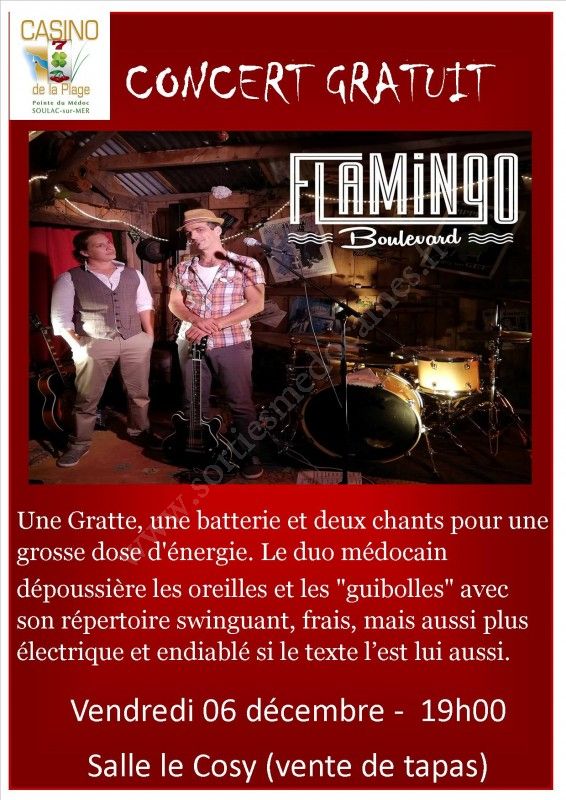 Concert gratuit du groupe "Flamingo Boulevard" à la salle Le Cosy du Casino de la Plage.