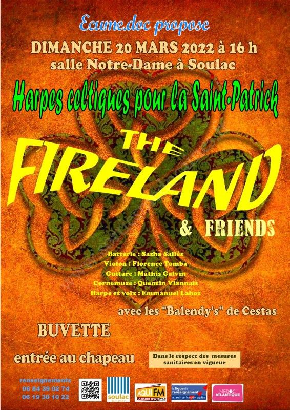 Le groupe musical « Fireland » dirigé par Emmanuel LAHOZ, harpiste et chanteur, interprètera un répertoire de musique irlandaise revisitée, accompagné par une cornemuse, une guitare, un violon et une batterie ainsi qu’un groupe de harpes « Les Balendy’s » de Cestas.