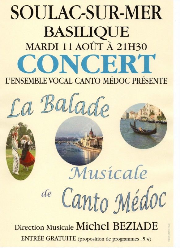 Une promenade musicale de l’Ensemble Vocal CANTO MÉDOC qui conduira l’auditeur de Venise (J. Offenbach) à Vienne (Le Danube Bleu) en passant par la Provence (chœur de magnanarelles extrait de Mireille de Gounod), le Pays Basque (deux chœurs d’hommes : Hégoak et Maita nun zira), Israël (Simi jadech), la Hongrie (Tabortuznel), l’Autriche (W.A Mozart : Piu non si trovano), deux chœurs célèbres : chœur de bohémiennes (La Traviata de Verdi), chœur des chasseurs (le Freischütz de Weber) etc…