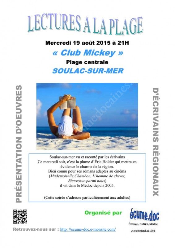 Ce mercredi 19/08, c'est la plume de Eric Holder, médocain d'adoption depuis 2005, qui mettra en évidence le charme de la région. Des textes d'autres auteurs seront aussi présentés. Vous pouvez, vous aussi, apporter des textes que vous souhaiteriez partager