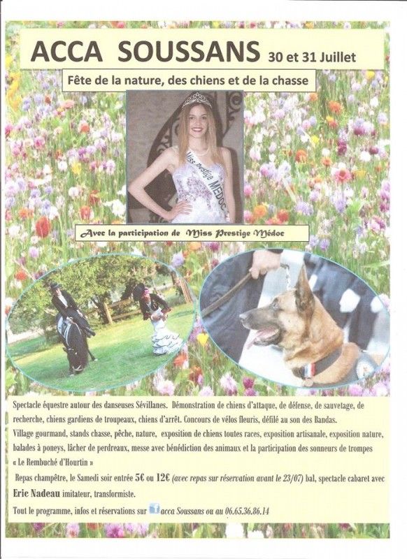 - Samedi 30 juillet 2016 à partir de 20h00 venez faire la fête avec nous lors d'une soirée haute en couleurs. Animé par Sono Deux Mille et un imitateur transformiste "Eric Nadeau". Une soirée moules-frites vous sera proposé. Entrée seul 5€ entrée + repas 12€. ATTENTION le nombre de places et limité, les réservations se font a la petite salle de réunion (sous la salle des fêtes de soussans) les mercredis de 18h00 à 20h00 et les samedis de 10h00 à 12h00 ou au 06.65.36.86.14. Réservations possible jusqu'au 23/07. ET EN FIN DE SOIREE UNE SURPRISE SERA AU RENDEZ VOUS