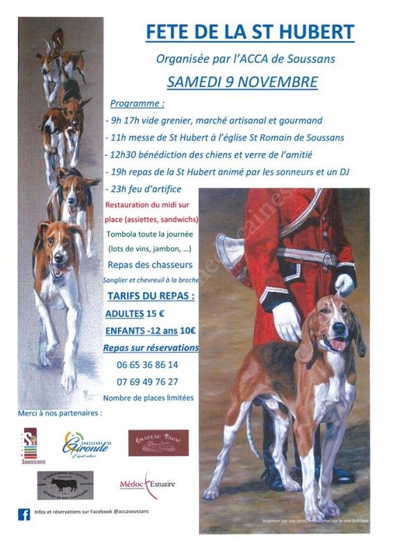 L'ACCA (Association Communale de Chasse Agrée) de Soussans organise la messe de la Saint Hubert, un vide grenier et un repas de la Saint Hubert.